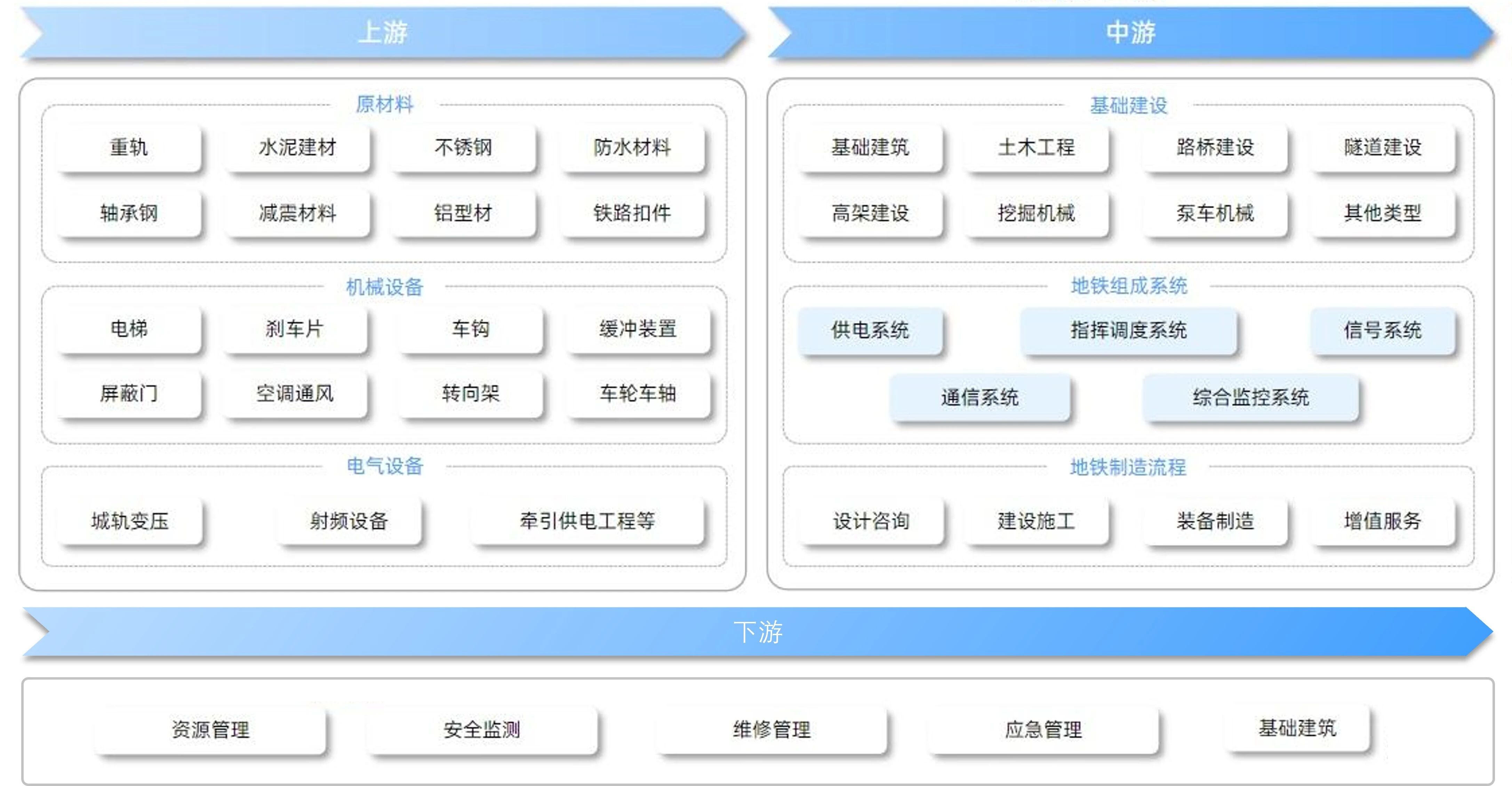 Rail transit connects urban industries, promotes the extension of the industrial chain, and drives the rapid development of supporting industries such as equipment manufacturing and technological R&D. The subway industry chain is shown in Figure 3, where all links are interdependent and drive the economic development of urban agglomerations and metropolitan areas.[2]