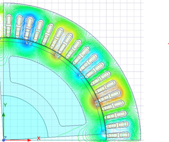 Against the background of global advocacy for green and low-carbon travel, rail transit construction has put forward higher requirements for energy conservation. Therefore, compared with other elevators, subway elevators require traction machines to have higher efficiency to meet urban scenarios with large passenger flow. For elevators with a speed of approximately 1 m/s, their efficiency can reach up to 90%. Moreover, under the requirements of elevator installation, the weight and size of the traction machine must be controlled. Therefore, traction machine design engineers need to have rich experience in electromagnetic design, optimize the electromagnetic design with advanced electromagnetic field analysis software (Figure 5), and select appropriate electromagnetic materials to meet the requirements.